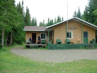 | They rent chalets here mostly to fishermen and hunters. The a-frame next to the cabin in the picture looks like something used to change engines in cars, but is for dressing moose. We have seen a few moose but no pictures yet. |