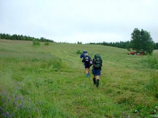 | When I found them they were on a road that was not where the trail was. I backtracked in the car to where the trail was supposed to turn into a field, but there was no sign or blaze. I passed a farm where a young boy was just leaving in his car. He didn't speak much English but with a couple of badly pronounced French words from me and pointing to the map, he indicated he would show me where it was. He drove to the spot I thought the trail was and walked into the weeds and pointed to a hole in the ground where the sign used to be. I went and got the girls and drove them to the spot. They dug around in the bushes and found the sign. They placed it so that it could be seen and continued on their way. |
