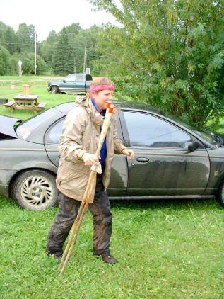| After dropping off the other's to hike Beth and I drove to Matane, QC to get Judy's film developed. We saw 2 hitch-hikers along the road and recognized them as "Mountain Dancer" and his son, now called "Rock Man". (He likes to collect rocks and carries them in his pack.) The son had hurt his ankle and they decided to return home in Quebec City. We drove them to the bus station and then continued on our errands. |